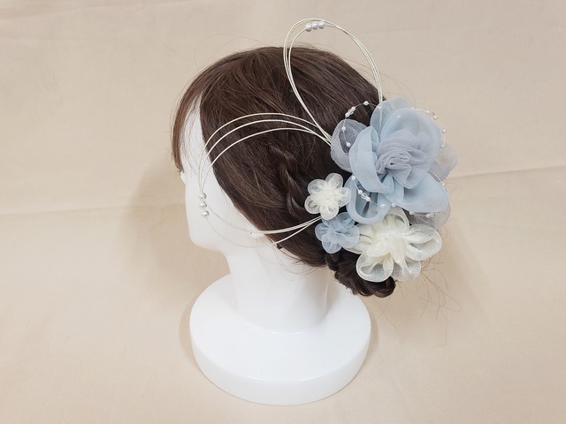 サテン生地にオーガンジーを重ねた絞り花が優し気な髪飾り。 トレンドの洋装カラーで今っぽく。 商品番号【4618】
