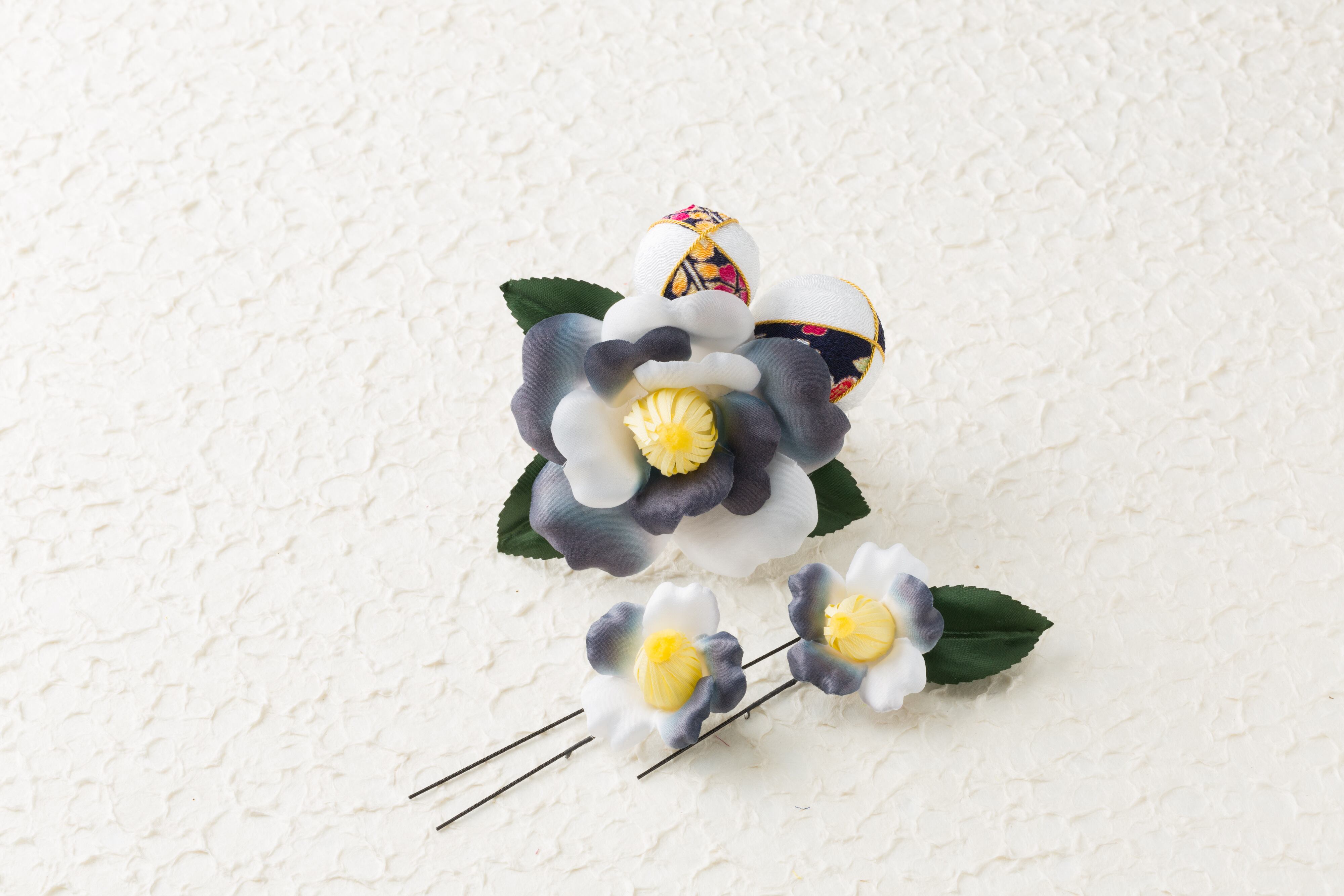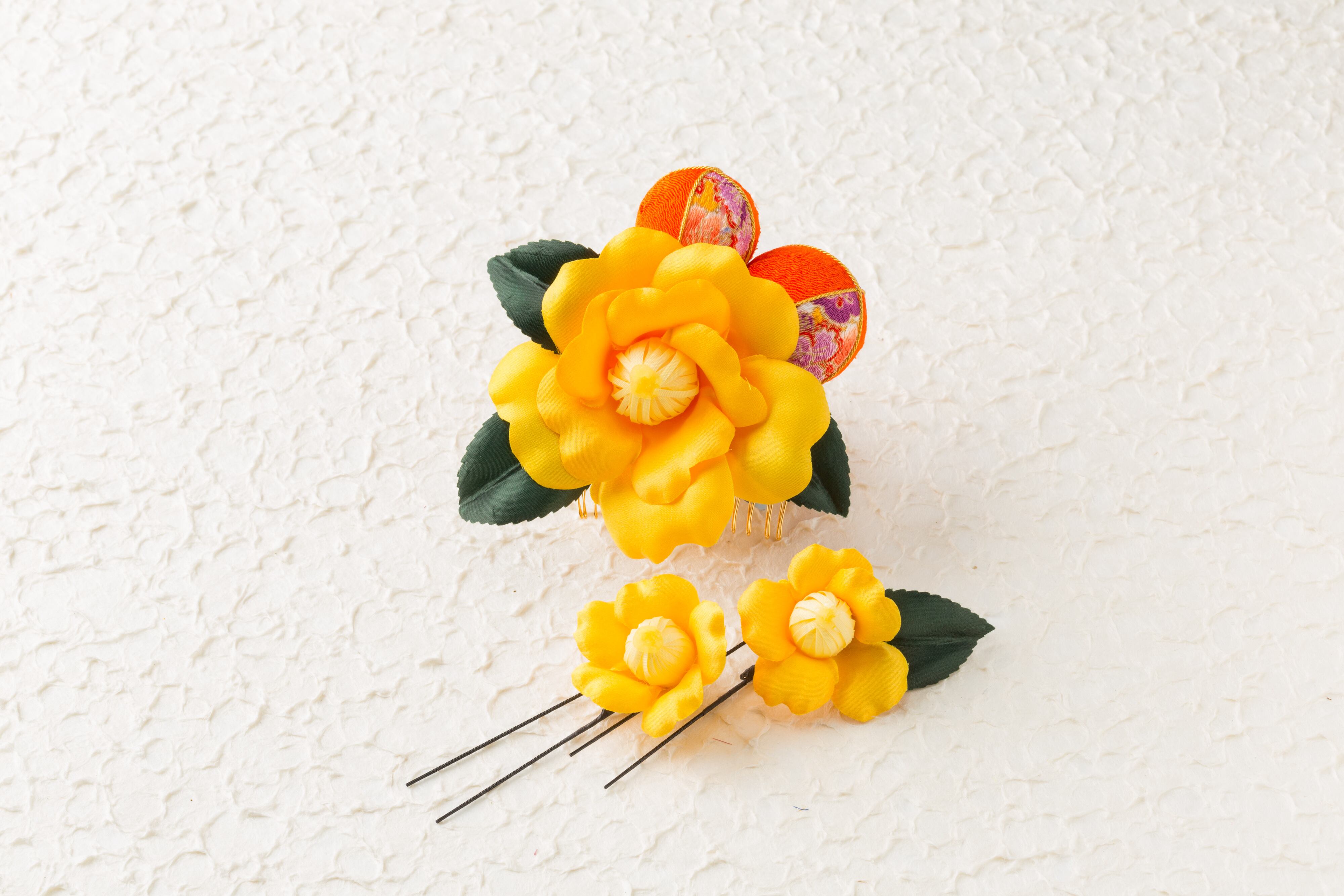 人気の椿モチーフは花だけでなく葉もリアルにこだわり丁寧に仕上げました。シンブルになりすぎないようちりめんの玉を配置。Uピンにも小さいリアルな椿を採用したのもポイントです。