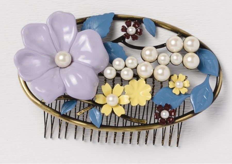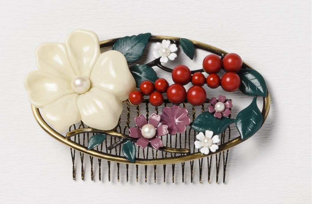 美しい花々が彩りを添える花園浪漫コーム。金属と樹脂を組み合わせたデザインは、まるで小さな箱庭のよう。可憐な草花が髪に華やかなアクセントを与えます。